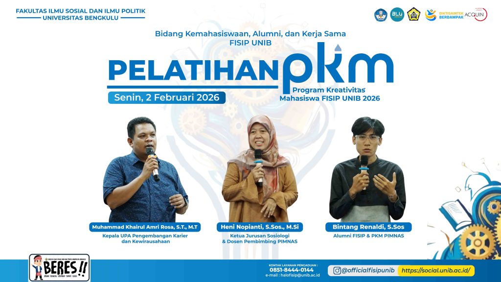 Fakultas Ilmu Sosial dan Ilmu Politik (FISIP) Universitas Bengkulu (UNIB) menggelar Pelatihan Program Kreativitas Mahasiswa (PKM) guna mendukung kesiapan mahasiswa dalam penyusunan dan pengajuan proposal tahun 2026. Kegiatan ini berlangsung pada Senin (2/2/2026) di Ruang International Meeting Room, Gedung Laboratorium Terpadu FISIP UNIB, dengan melibatkan sekitar 70 mahasiswa dari seluruh jurusan dan program studi selingkung FISIP.